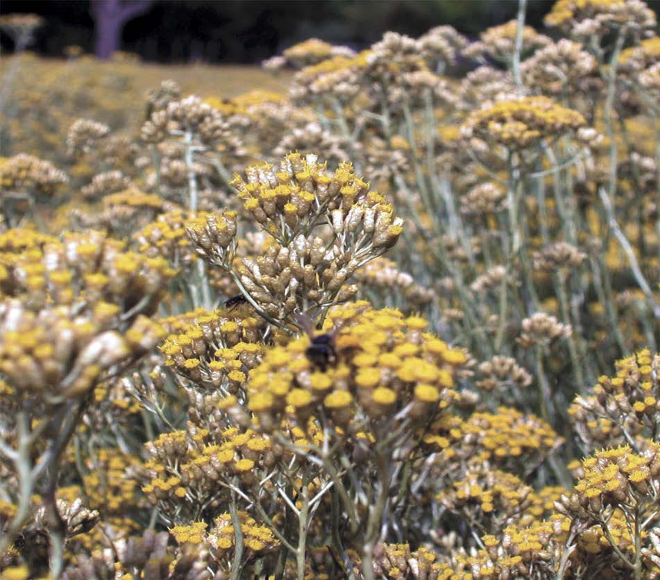 Helichrysum italicum ssp serotinum présente dans le Languedocet le Nord-Ouest de l’Afrique appelée immortelle tardive.