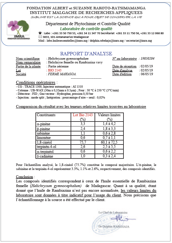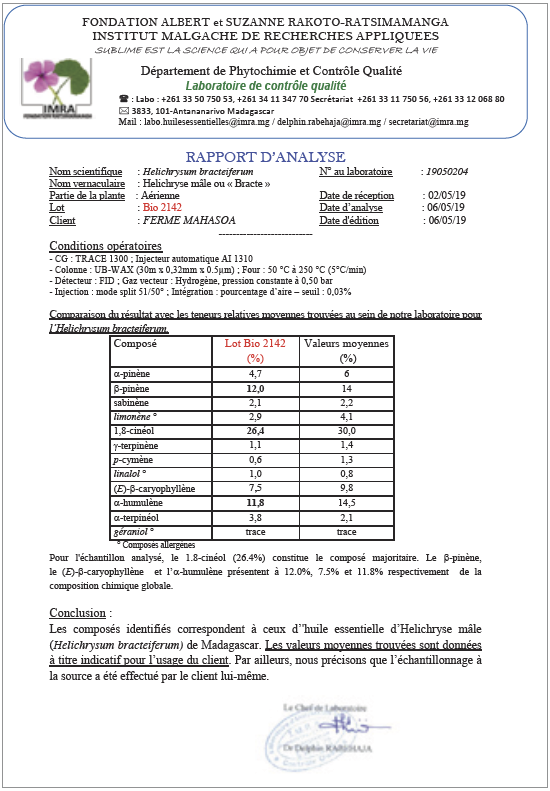 Certains auteurs la désignent comme anti-catharale, elle l’est comme toutes les huiles essentielles proposant un peu de cinéol 1.8 mais c’est souvent dû à un mauvaise récolte où les deux helichryses sont collectées et mélangées à la distillation. A l’IMRA où la plupart des huiles essentielles de Madagascar sont analysées on a trouvé des helichryses mâles contenant plus de 40% de cinéol ce qui confirme une récolte non documentée botaniquement. Celle que je produis ne contient pas plus de 15% ce qui confirme la qualité du tri car les plantes se ressemblent assez.