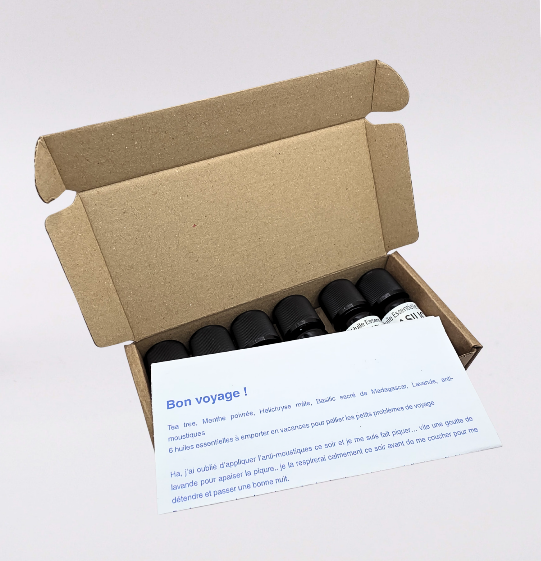 Coffret Voyage de 6 huiles essentielles bio à emporter partout : Tea Tree, Menthe Poivrée, Hélichryse Mâle, Basilic Sacré de Madagascar, Lavande et Anti-Moustiques. Idéal pour les petits imprévus des vacances, avec livret explicatif d’utilisation.