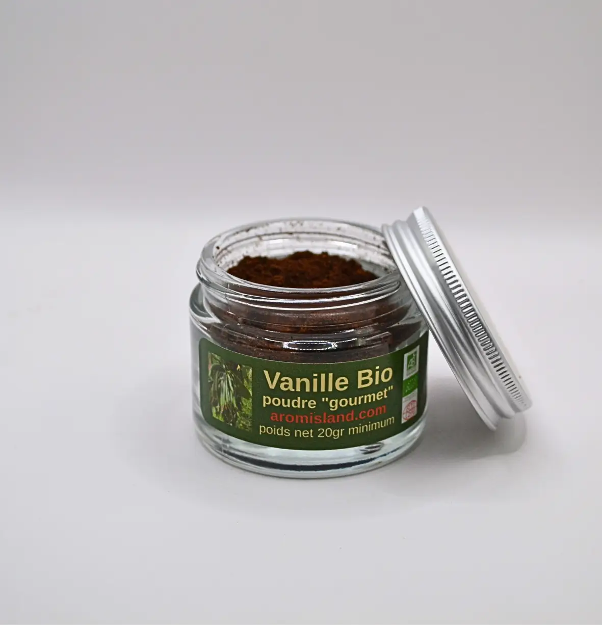 Poudre de Vanille de Madagascar 100 % pure et bio, issue de gousses Bourbon finement broyées. Présentée en pot en verre de 20 g pour une conservation optimale, idéale pour la pâtisserie, les desserts et la cuisine créative.